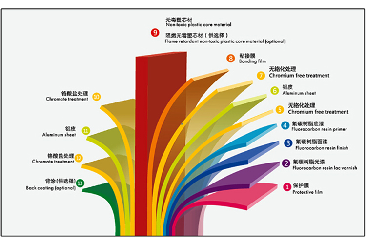 5、按照鋁塑復合板國家標準 GB/T17748-1999生產(chǎn)的氟碳外墻板,涂層采用70%的氟碳樹脂,在正常氣候環(huán)境條